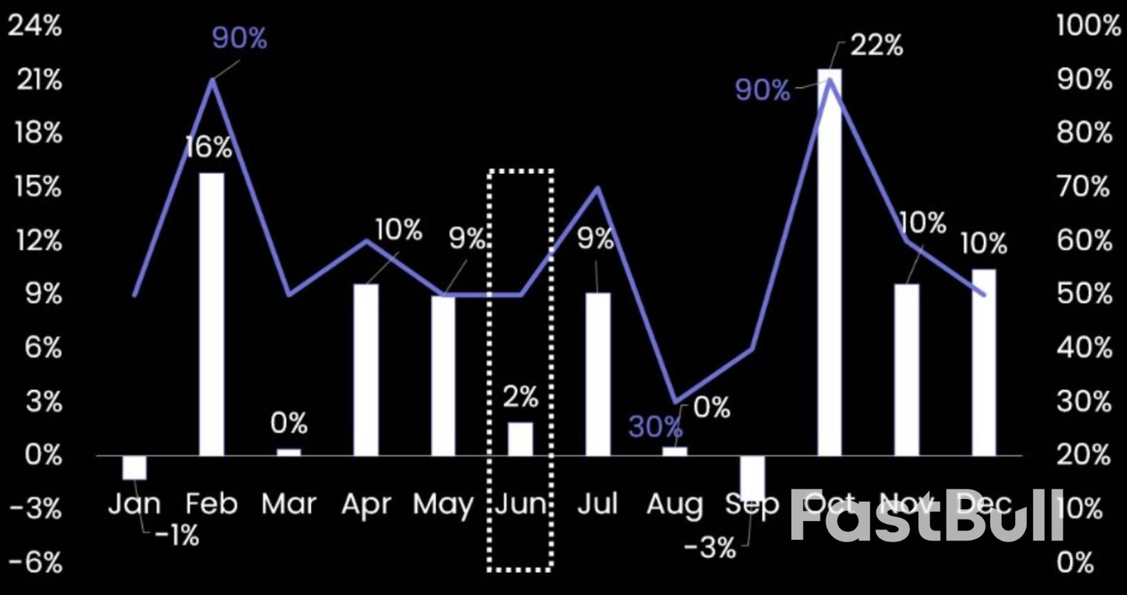 自2020年以来,BTC在6月份往往跌多涨少。历史数据显示,六月平均收益率仅为1.9%,上涨概率为50%。