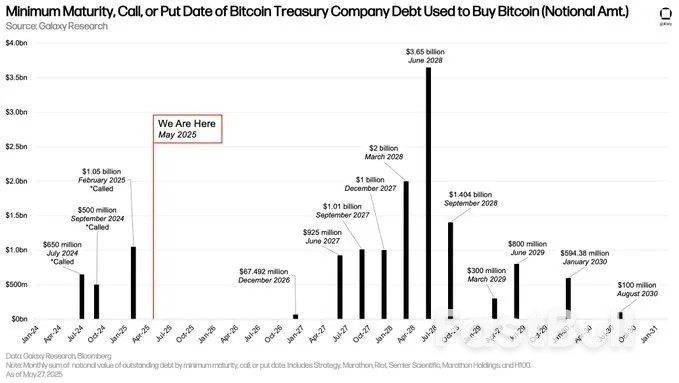上图统计了比特币财库公司为购买比特币而发行的债务,并列出了这些债务可能被要求偿付的最早日期(到期/赎回/行权日),以及对应的债务名义金额。