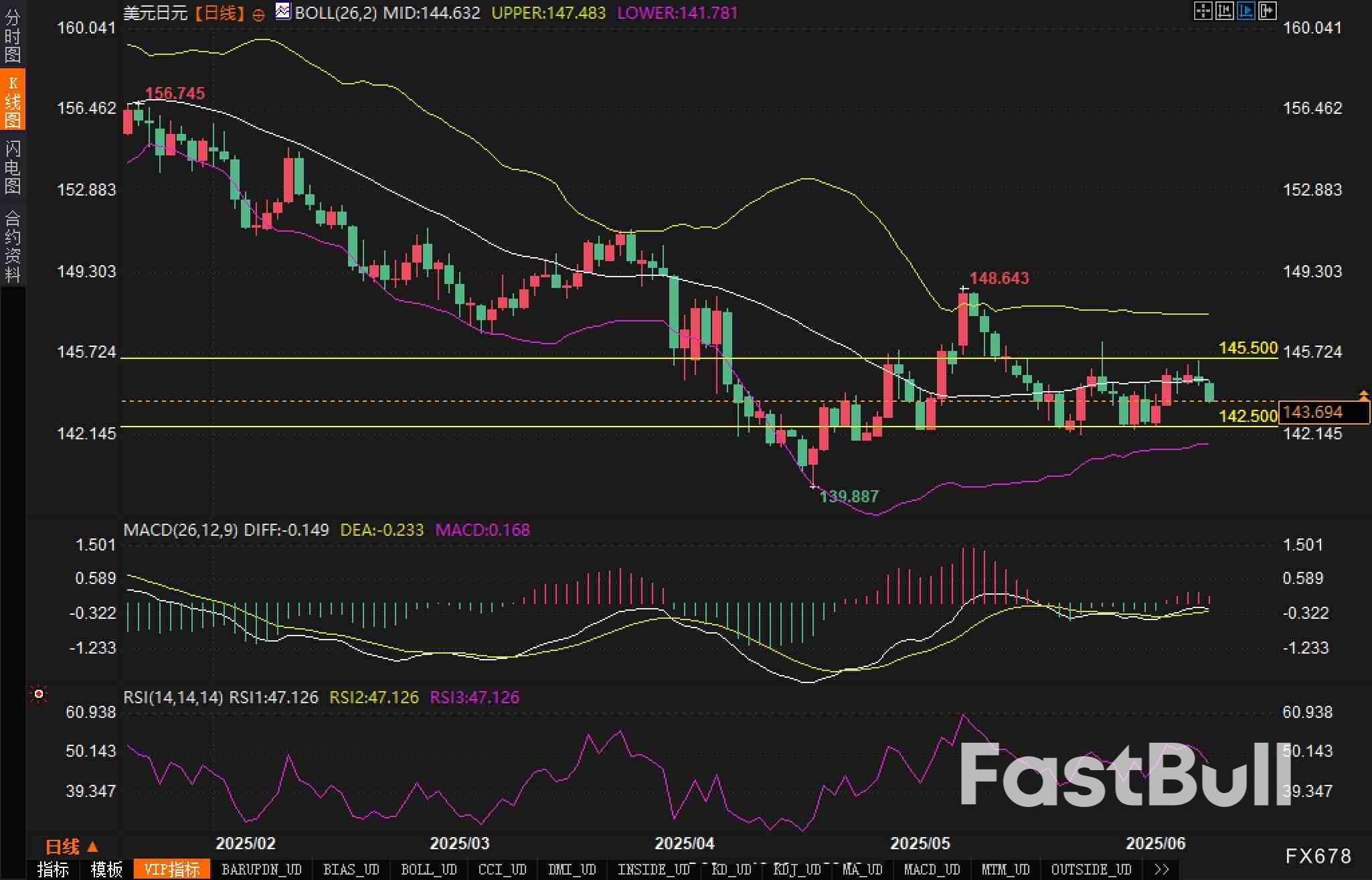 分析认为汇价重要支撑位于142.500一线,该位近期多次测试未破;若有效跌破,则将打开下行空间,下一支撑关注141.78(布林带下轨)。上方阻力位则看向145.500附近,该位多次构成阶段高点并压制价格反弹。
