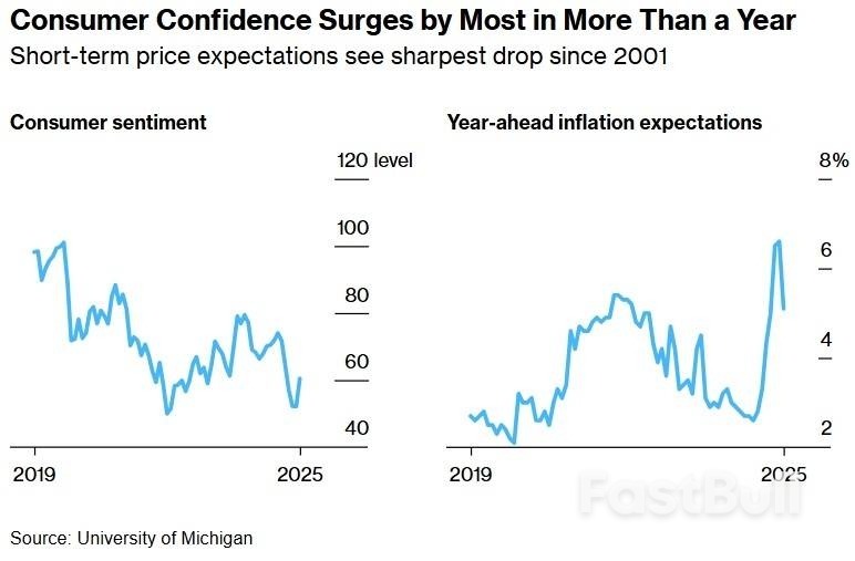 美国消费者信心指数出现自2024年1月以来的最大涨幅。随着对经济担忧的缓解和短期通膨预期的显着改善,密西根大学6月信心指数初值较上月飙升8.3点至60.5,远超彭博经济学家调查中的所有预期。