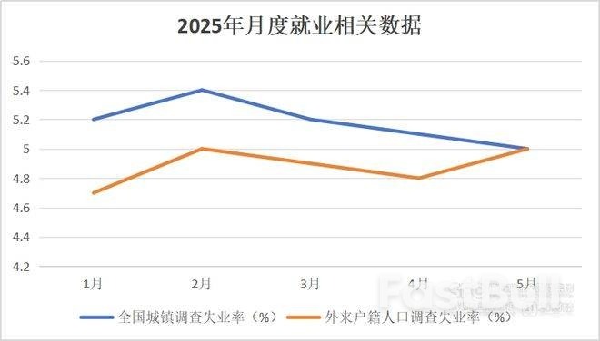 值得注意的是,5月份,外来户籍人口调查失业率和外来农业户籍人口调查失业率均比上月提高0.2个百分点,同比提高幅度更大,这提醒需要高度关注国际经贸复杂形势对相关行业就业的影响。