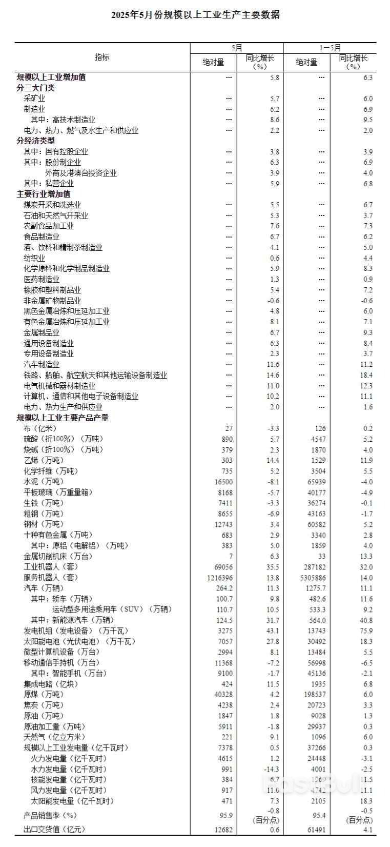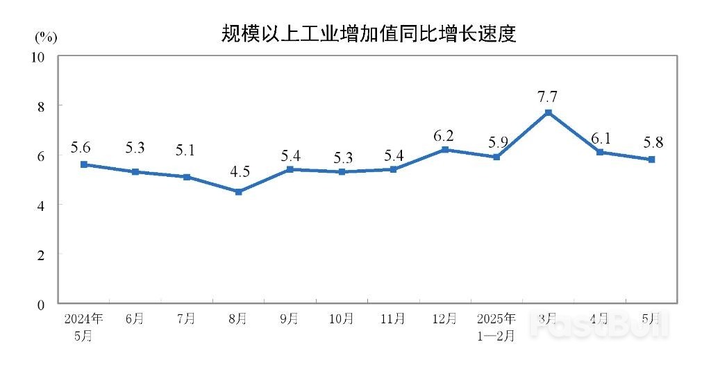6月16日周一,国家统计局公布数据显示,5月份,规模以上工业增加值同比实际增长5.8%(增加值增速均为扣除价格因素的实际增长率)。