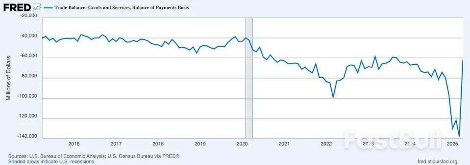 以下是美国贸易逆差情况,显示2024年末和2025年初美国企业购买外国商品的数量激增。