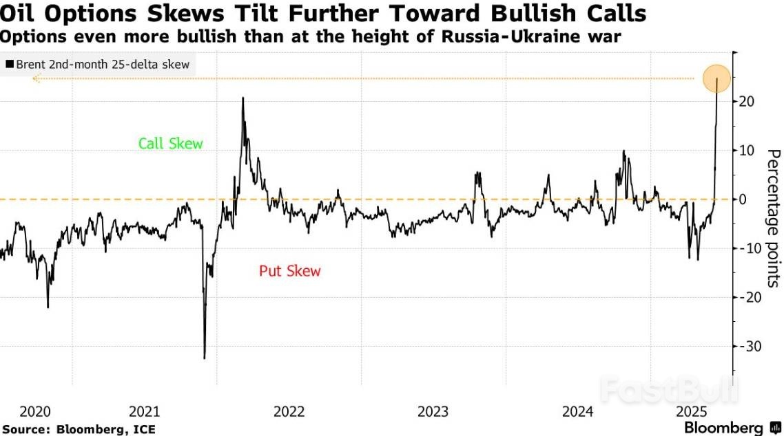 截至周二收盘,布伦特原油看涨期权相对于看跌期权的溢价是2013年以来最宽的。由于最近几天期权合约的换手率高于往常,衡量隐含波动率的指标也急剧上升。