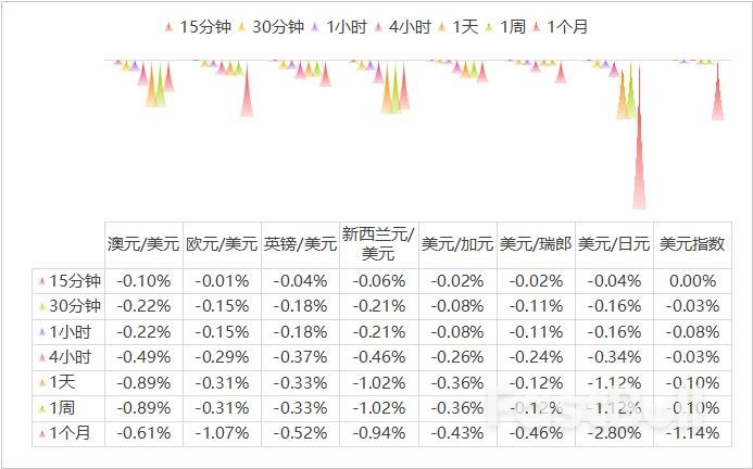 澳元/美元和新西兰元/美元在短期波动较大。美元指数在短期波动最小,中长期波动(1天-1个月)。美元/日元和新西兰元/美元在1天周期的波动最为剧烈,欧元/美元和美元/日元在1个月周期的波动最大