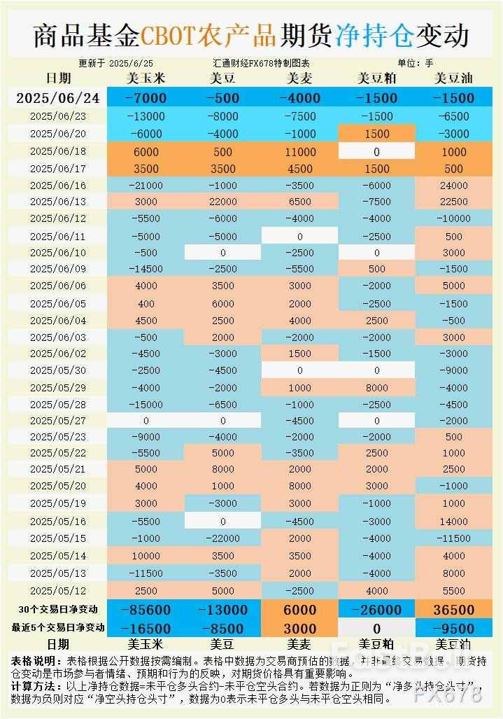 2025年6月24日当日,大宗商品基金:增加CBOT玉米投机性净空头;增加CBOT大豆投机性净空头;增加CBOT小麦投机性净空头;增加CBOT豆粕投机性净空头;增加CBOT豆油投机性净空头。