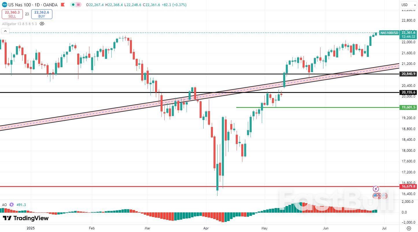 日线图显示,笔者反复强调,7月初前后为下一个重要时间节点,投资者需警惕市场短期波动加剧的可能。与此同时,纳斯达克100指数目前仍维持明确的上升趋势,若纳斯达克100指数企稳22000点,后市或进一步上行挑战23000点甚至23600点水平。但若短期内失守22000点,则需警惕回调加剧的可能。