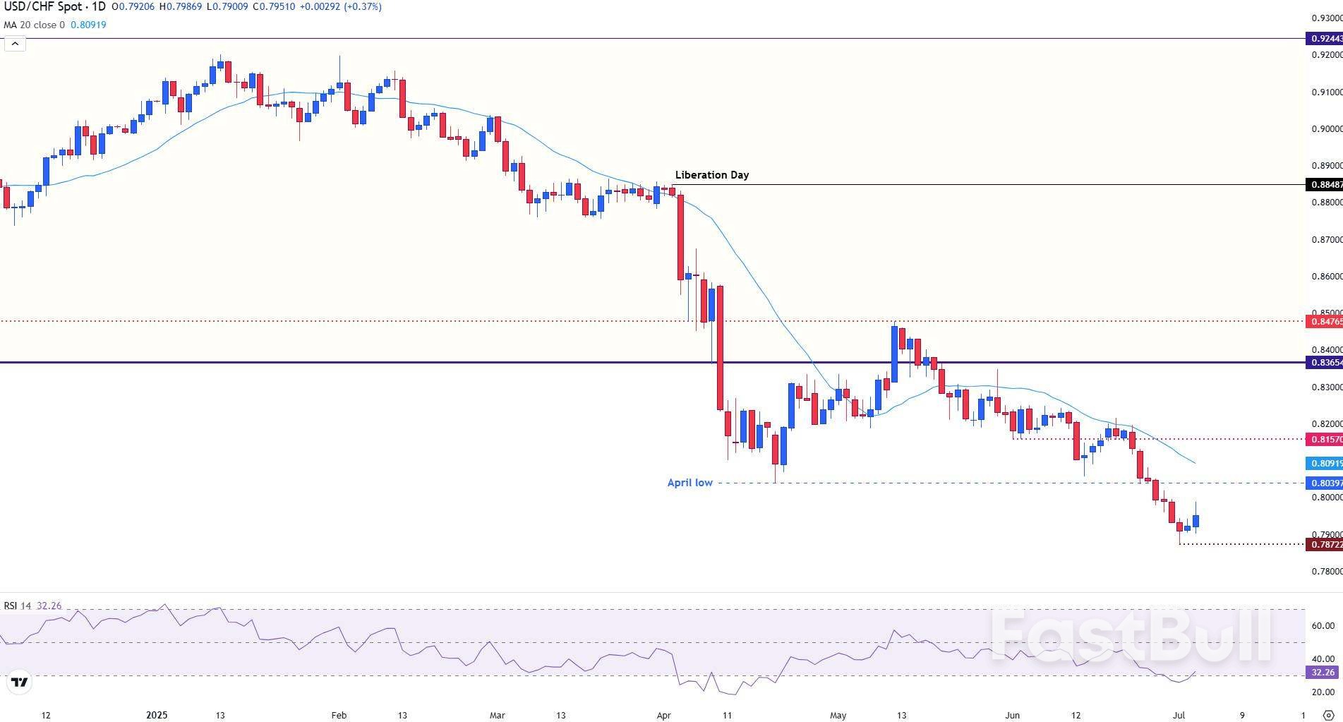 美元/瑞郎反弹至0.8000附近,相对强弱指数试图摆脱超卖区域。