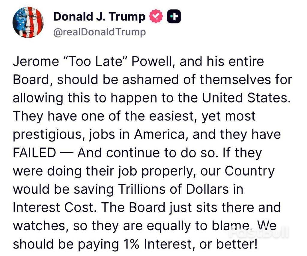与此同时,特朗普在社交媒体上将矛头指向了整个美联储理事会,称鲍威尔及其同事“应该为让这种事发生在美国身上而感到羞耻”。这延续了他数月以来对鲍威尔的攻击,此前他曾直接侮辱鲍威尔,甚至威胁要将其解雇,并在上周五公开喊话让鲍威尔辞职。