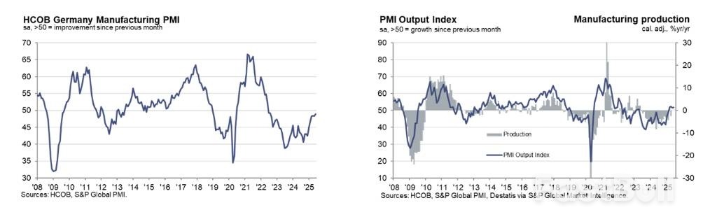 数据显示,德国制造业PMI从5月的48.3上升至6月的49.0,创下34个月新高。产出指数达到51.9,为两个月高点。