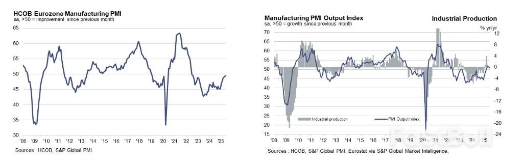 欧元区制造业6月显现企稳迹象,PMI升至49.5,创2022年8月以来最高水平,已连续第四个月录得产出增长。新订单在6月实现稳定,结束长达37个月的下滑周期。出口订单也止跌企稳。