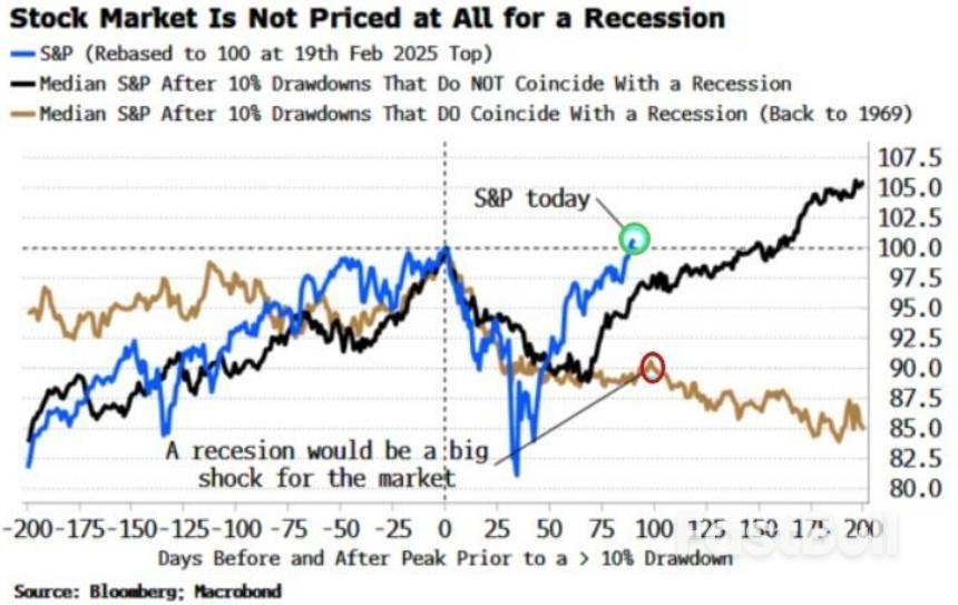 对于股市来说,关键在于软数据预示的潜在放缓是否最终演变为衰退,这很大程度取决于美联储宽松的时机与幅度。当前市场已全面押注“非衰退”情景,若衰退发生,股市将从当前水平大幅下跌。