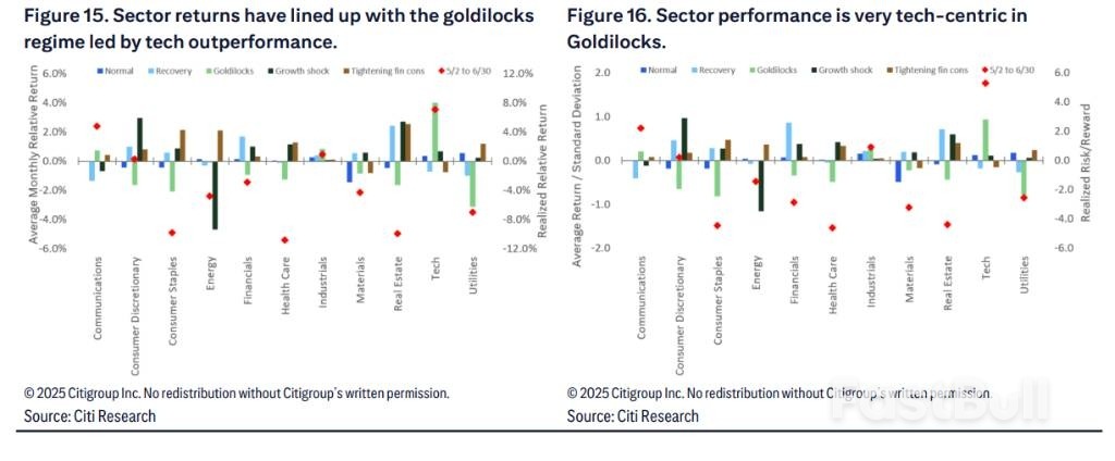 相比之下,科技股和成长股有望继续受益。花旗数据显示,在金发姑娘环境中,科技和通讯服务板块表现最佳,而消费必需品、公用事业和医疗保健等防御性板块表现不佳。