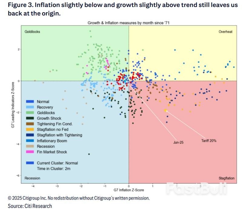 不过,报告也提到,当前市场并非完全“金发姑娘”状态,更偏向于“正常”状态(Normal Regime):经济增长略高于趋势水平,通胀略低于趋势。真正的“金发姑娘”需要更极端的条件:通胀需比10年均值低1个标准差,增长则需高出1.4个标准差。尽管状态未完全达标,当前资产表现已呈现“金发姑娘”特征:科技股强势领跑,信用资产受追捧,但固定收益表现挣扎。