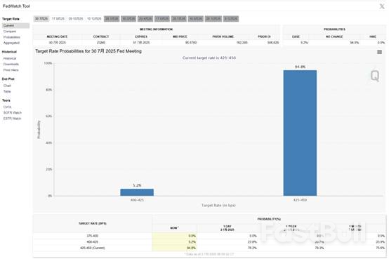 在非农数据公布后,美联储降息预期有大幅降温。芝商所的美联储利率观察工具显示,美联储7月维持利率不变的概率已飙升至94.8%,降息概率仅为5.2%,而一天前这一概率为23.8%。