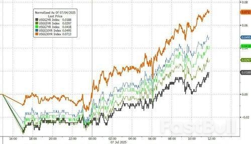 在结束了上周末“独立日”假期的小长假后,美债价格周一普遍走软,其中长债收益率普遍走高,因美国关税闹剧波澜再起,令不少投资者唤起了4月“解放日”对等关税后美债市场惨遭抛售的回忆。