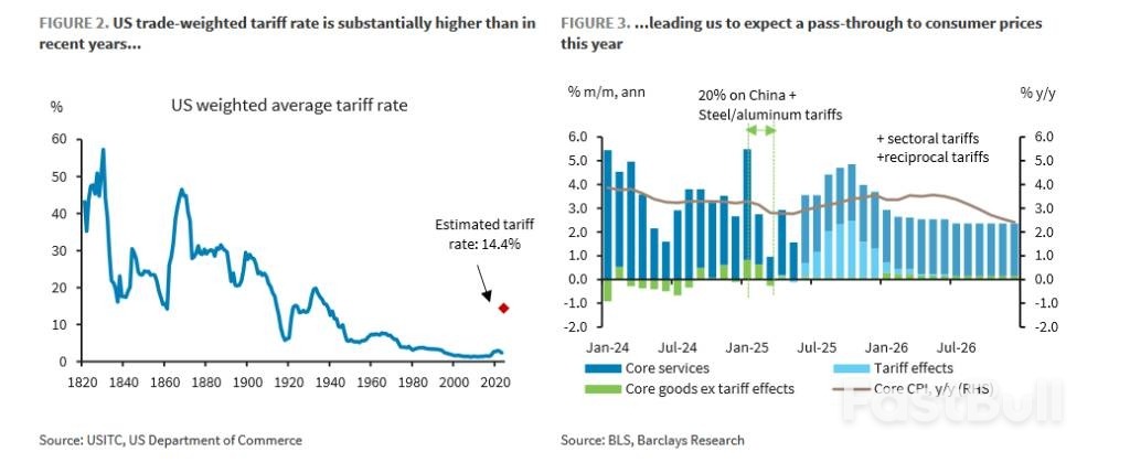 巴克莱经济研究部门称,今年美国通胀预测的主导因素将是关税,估计美国贸易加权关税率已从年初的2.5%跃升至约14-15%,增加了12个百分点的进口成本。