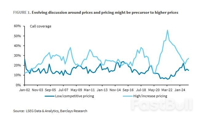 值得注意的是,"价格"和"提价"的讨论变得更加突出,使得2025年第二季度的覆盖率达到78%,几乎与2008年底和2009年初的79%峰值持平。企业高管在当前报告季度更频繁地描述价格为"高"或"增加",而较少提及"低"或"有竞争力"的价格。