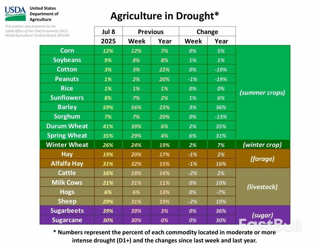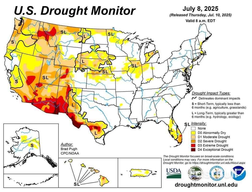 根据美国农业部(USDA)经济首席办公室(OCE)及世界农业展望委员会(WAOB)于2025年7月10日发布的最新《农业干旱报告》显示,截至2025年7月8日,美国多个主要农产品产区正经历从中度干旱(D1)到极端干旱(D3)的不同级别干旱状况。这一现象揭示了干旱对谷物、经济作物及畜牧业产生的显著影响: