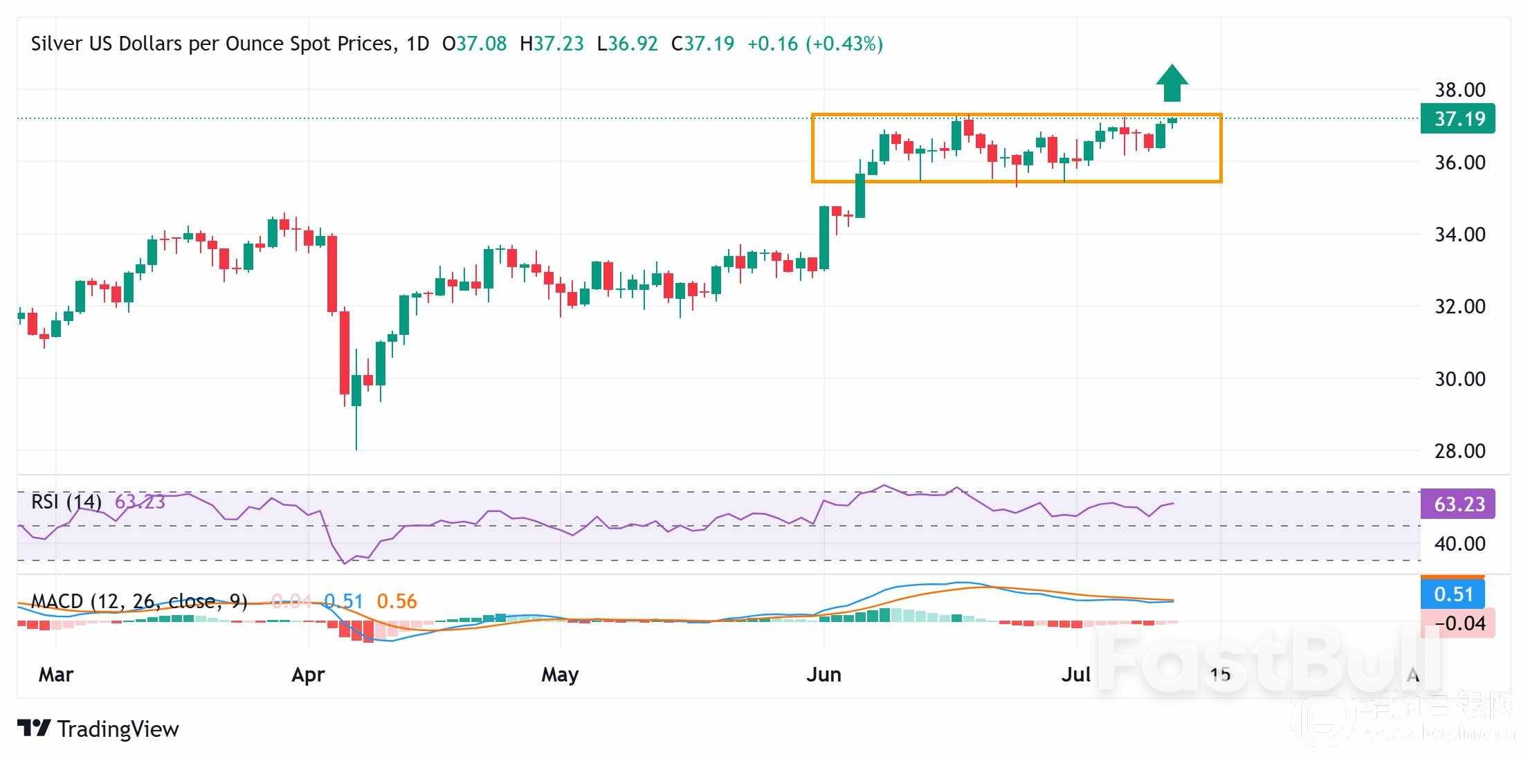 周五(7月11日),白银连续第二个交易日上涨,并在的亚洲交易中测试了数周以来压力上限。日内最高上探至37.45美元/盎司,目前交投在37.20美元附近交易,当日上涨0.40%。