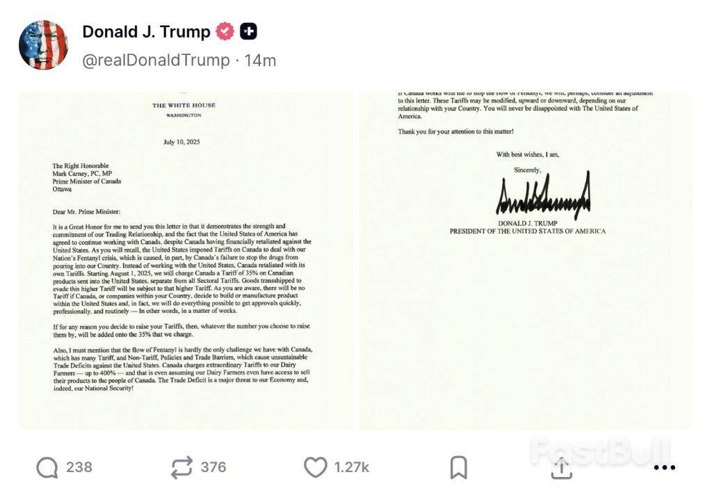 特朗普在信中称,若加拿大决定提高对美关税水平,无论增加税额是多少,美国将在上述35%关税基础上对等增加。