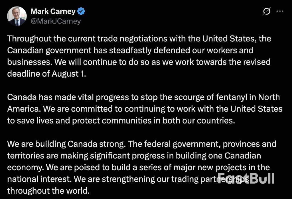 卡尼在社交媒体上说,在当前与美国的贸易谈判中,加拿大政府一直坚定地维护本国工人和企业的利益。“我们将继续这样做,并朝着8月1日这一修订后的最后期限而努力。”