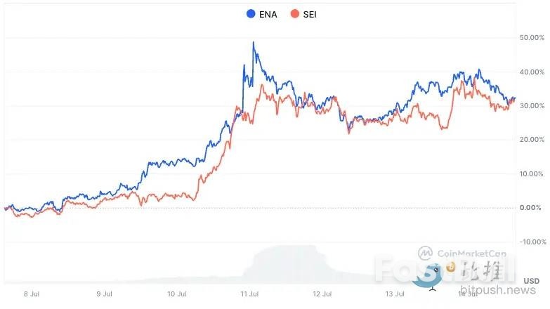 一些相对较新的山寨币,如专注于去中心化交易所(DEX)的L1项目Sei(SEI)和合成美元协议Ethena(ENA)涨幅同样不俗,7日涨幅也超过了30%。