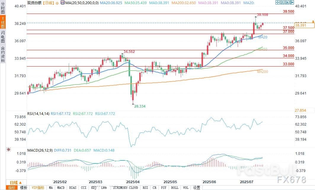 白银近期展现出强劲的上行趋势,价格在突破关键阻力位37.50美元后,进入高位盘整阶段。根据最新市场数据,截至7月17日白银价格年内涨幅已达24.82%,远超黄金同期表现。