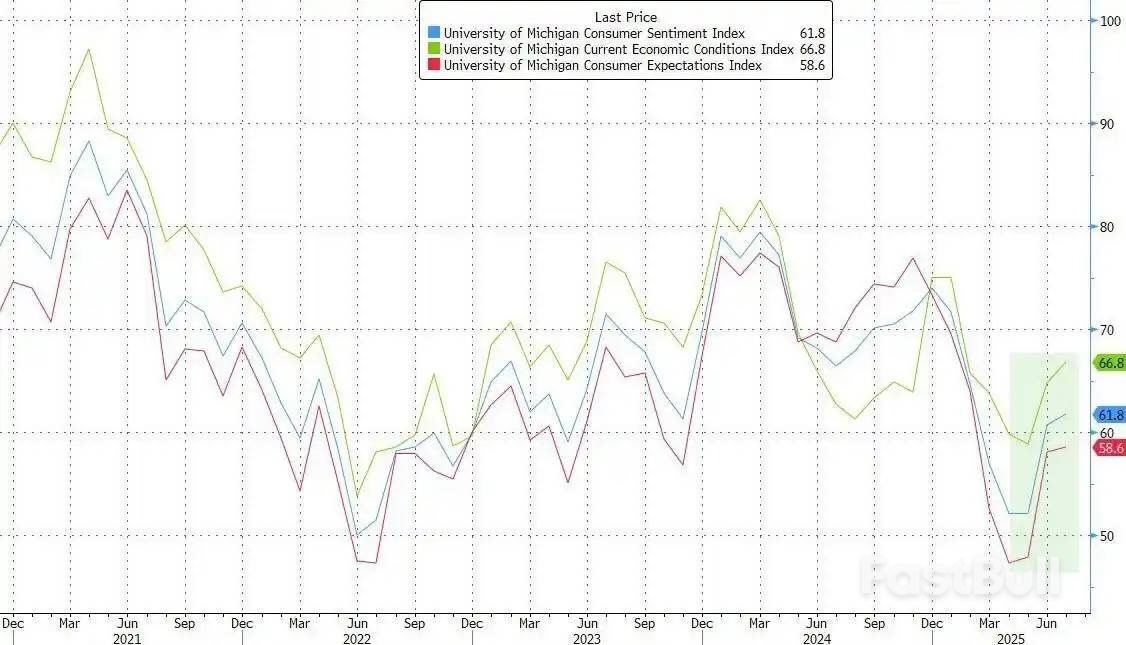 密歇根大学消费者调查主任Joanne Hsu表示,美国消费者信心与6月相比变化不大,小幅上升约1个点至61.8。尽管该指数创下五个月新高,但仍比2024年12月低约16%,且远低于历史平均水平。