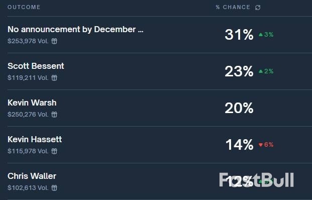 美联储前理事凯文·沃什(Kevin Warsh)和白宫国家经济委员会主任凯文·哈西特(Kevin Hassett)分列二三,分别为20%和14%,沃勒在12%附近。