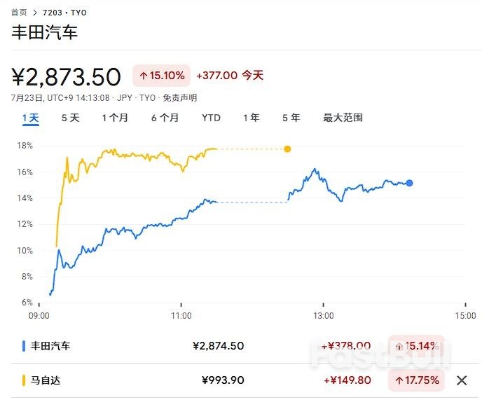 据央视新闻,当地时间7月22日,美国总统特朗普通过社交媒体宣布美国与日本达成贸易协议:对日关税税率为15%及日本5500亿美元对美投资。这一水平低于投资者此前担心的25%。消息传出后,日本基准股指东证指数和日经225指数均上涨超过3%,汽车股涨幅尤为突出,马自达汽车股价一度飙升18%,丰田汽车涨幅超过15%。