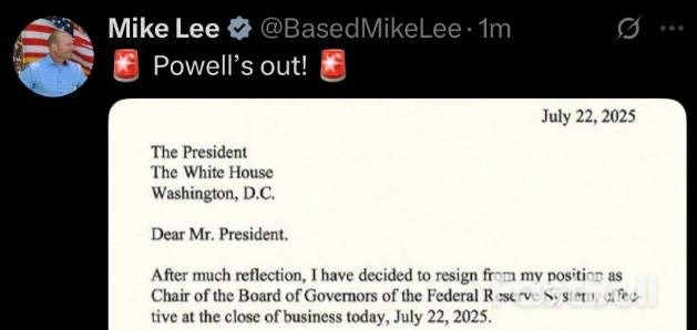 近期,美国社交媒体X上流传着一张“鲍威尔辞职信”的截图。但就是这张“一眼假”的图片,骗到了一位共和党联邦参议员和一名保守派网红。