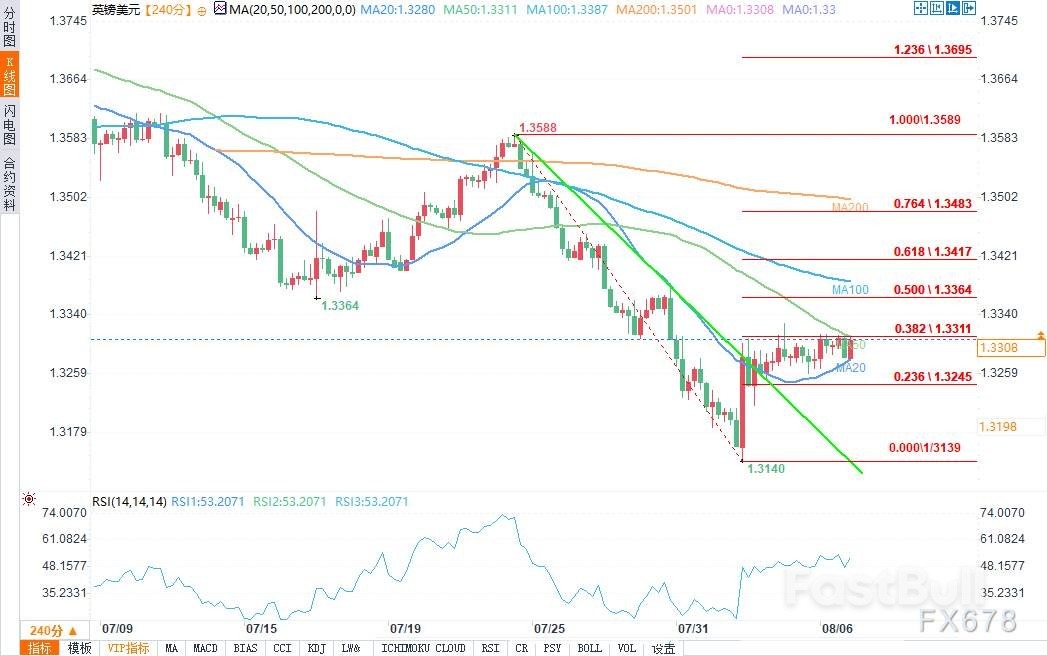 汇价在1.3139形成低点后,目前正尝试反弹,上破1.3250一线,并攻克了那条阻力位在1.3280的下行趋势连接线。
