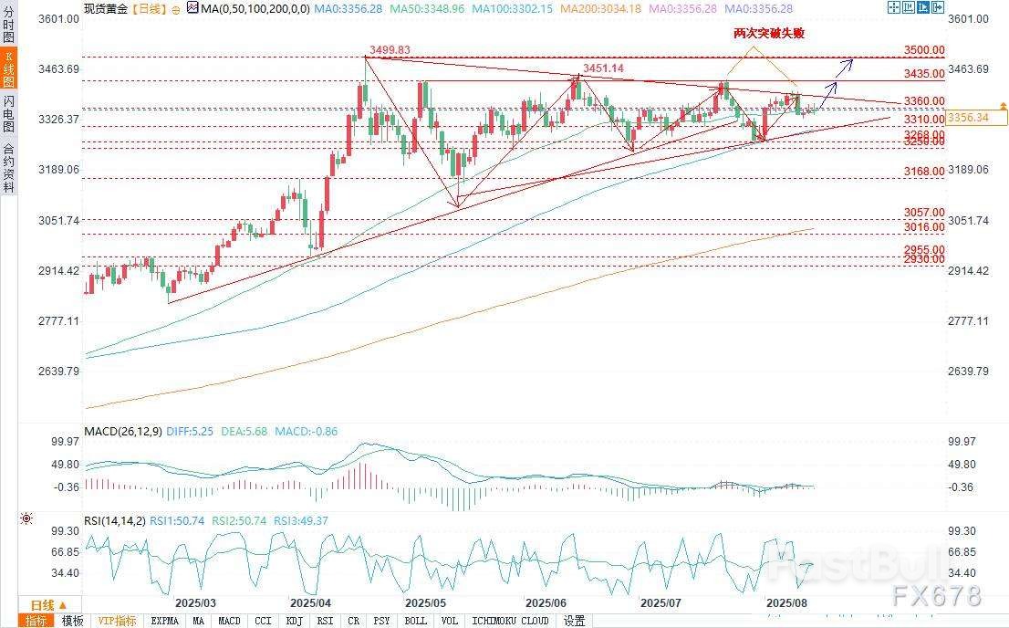 若金价突破并收于4月以来的下降趋势线上方,3435美元的水平阻力位将是多头面临的第一道关卡——该位置在过去三次测试中都抑制了涨势。按照惯例,若看涨三角形突破后该阻力位失守,当前3500美元的历史高点将进入视野。