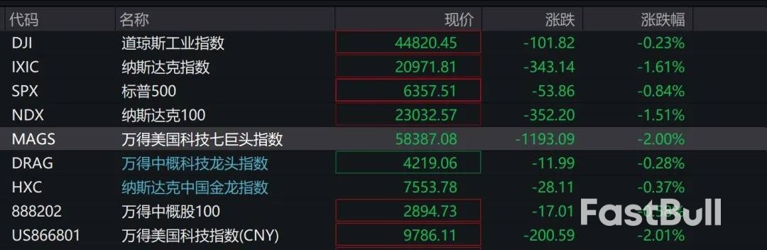 道指跌57.64点,跌幅为0.13%,报44864.63点;纳指跌255.65点,跌幅为1.20%,报21059.30点;标普500指数跌38.76点,跌幅为0.60%,报6372.61点。