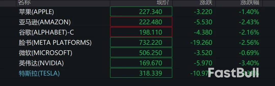 美股科技股下跌,万得美国科技七巨头指数跌2%,英伟达、特斯拉跌幅超3%,亚马逊、谷歌、脸书跌超2%。