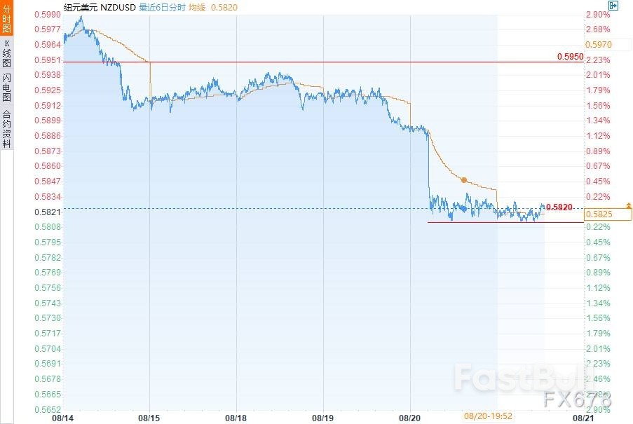 周四(8月21日)欧盘时段,纽元/美元整体呈现震荡格局,无清晰的单边上涨或下跌趋势 。价格在一定区间内反复波动,多空力量阶段性博弈,尚未形成持续的方向指引。
