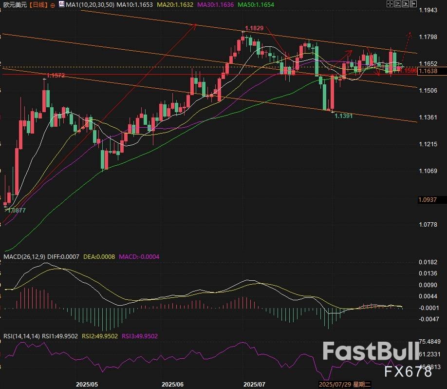 同时技术面也显示,欧元兑美元汇价的MACD回归零轴附近后的反弹无力,RSI开始小于50,进入空方底盘,均线方向不一,暗示市场多空势均力敌,但长期上涨旗形依然存在,1.16关口处有很强支撑,是对8月1日晨星形态突破的关键位,价格运行到附近可以积极试仓。