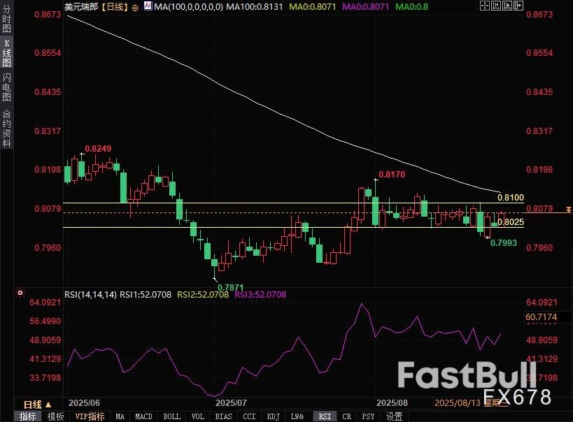 周三(8月27日)欧市时段,美元兑瑞郎(USD/CHF)持续震荡走强,日内涨幅约0.50%,收复前一交易日失地,目前已超越本周高点0.8070,周三美元表现优于其他主要货币,并未受到特朗普总统试图影响美联储决策的干扰,该货币兑短期呈持续走强趋势。