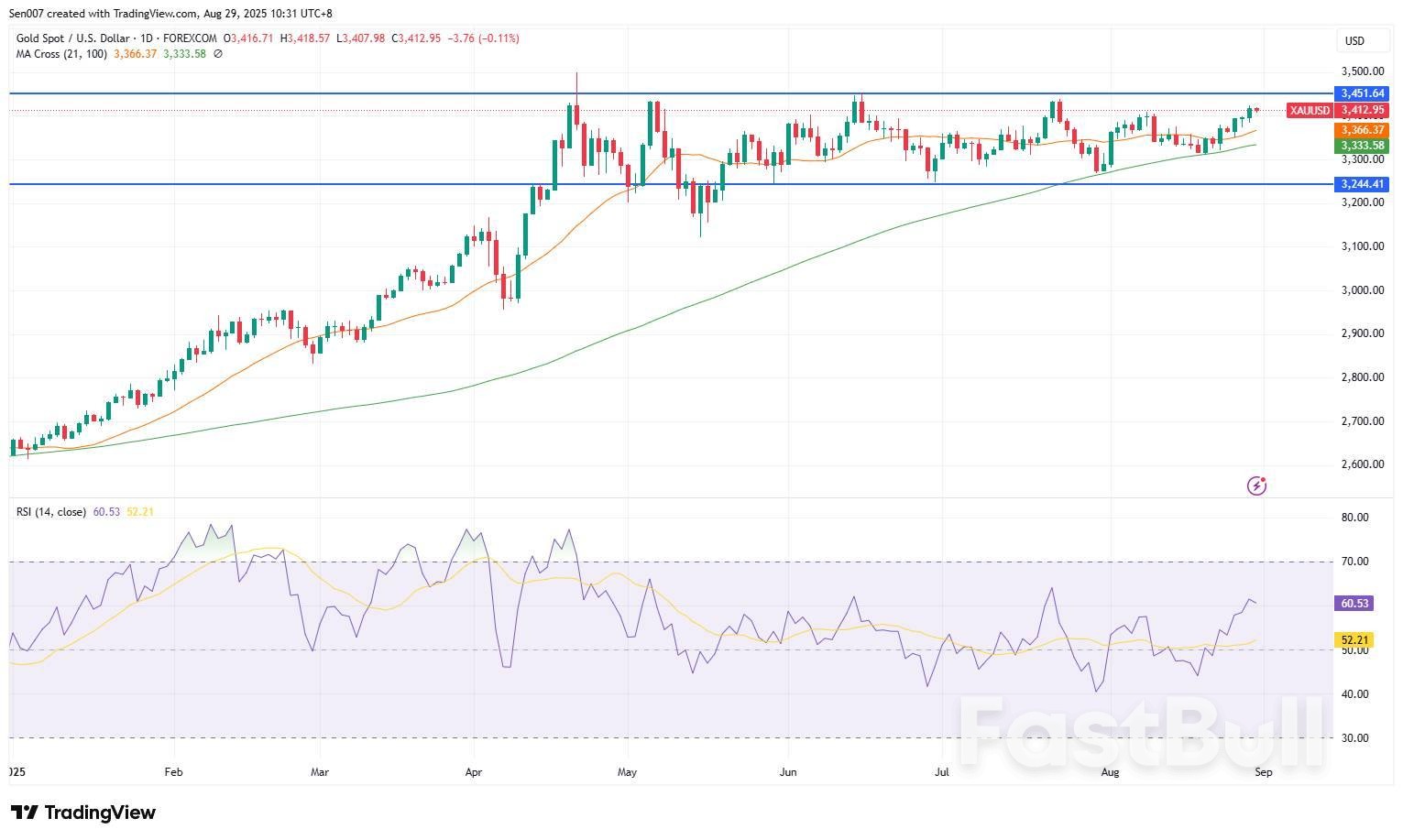 8月28日,黄金价格涨至3423美元/盎司,连续第三日上涨,创五周新高。