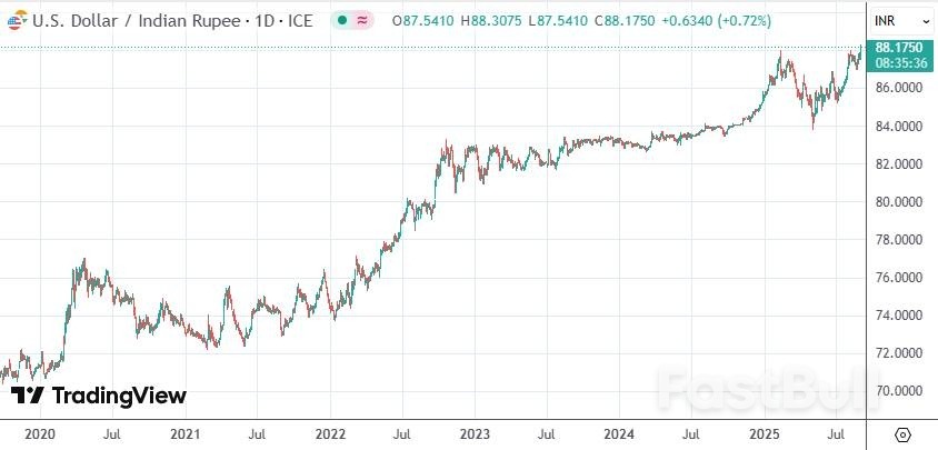 周五(8月29日)欧洲时段,印度卢比汇率跌至历史新低,因印度输美商品的关税税率已增至50%,引发市场担忧。