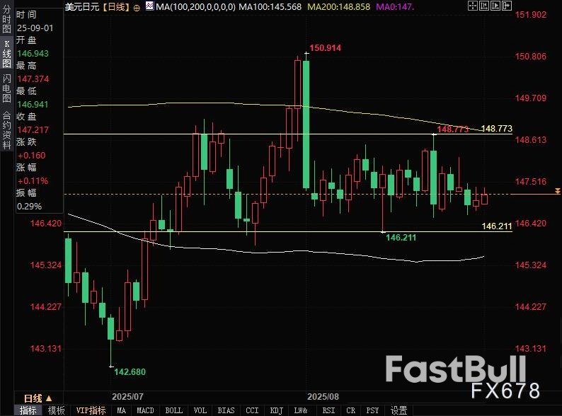 周一(9月1日)亚市早盘时段,美元兑日元震荡走强,最高触及147.37附近,而后回落,现交投于147.05附近。由于日本通胀压力降温削弱了市场对日本央行年内再次加息的预期。市场正等待周二晚些时候公布的美国ISM制造业PMI报告,以及周五公布的备受瞩目的美国非农就业数据。美元指数持稳于97.85附近,陷入窄幅盘整。