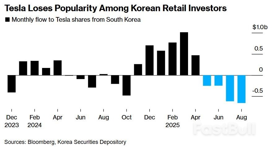 根据彭博对存托管数据的测算,8 月份韩国散户投资者净卖出特斯拉股票价值约6.57亿美元,为至少自2023年初以来的最大规模资金净流出。相反,韩国散户投资者们非常偏好波动性更高的美股市场投资标的,例如被视为以太坊(Ether)代理的 Bitmine Immersion Technologies Inc(BMNR.US),其净买入价值高达 2.53 亿美元,跟踪以太坊与比特币的ETF也呈现韩国散户净买入。韩国散户们的这波最新资金出逃表明,特斯拉最忠诚的全球散户群体之一对于特斯拉的“牛市叙事信仰”狂热正在大幅减退,他们曾经的逢低买入热潮与看涨期权大举买入热潮一度创纪录放大了该股的涨势。
