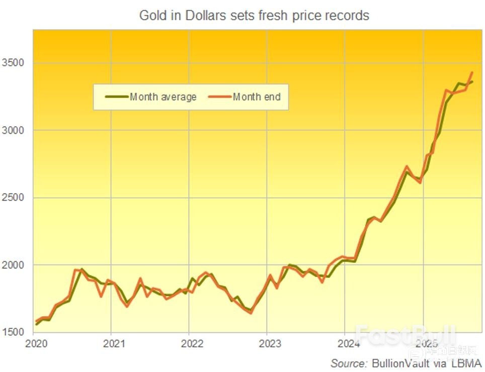 伦敦下午3点的基准拍卖金价超3429美元/盎司,较7月底上涨近3.9%,创下月末新纪录,仅比4月中旬现货市场3500美元的历史高点低70美元。这使得8月份的黄金均价达到3363美元/盎司,这也是今年8月份以来的第7个创纪录的月份。历史上仅有1972年出现过黄金1月至8月月均价格连续创新高的行情。在上周五3点的伦敦黄金定盘价之后,现货黄金报价进一步上涨,升至11周高点3442美元。