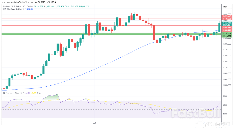 如果铂金保持在1420美元上方,则将向下一个阻力位1450-1455美元前进。
