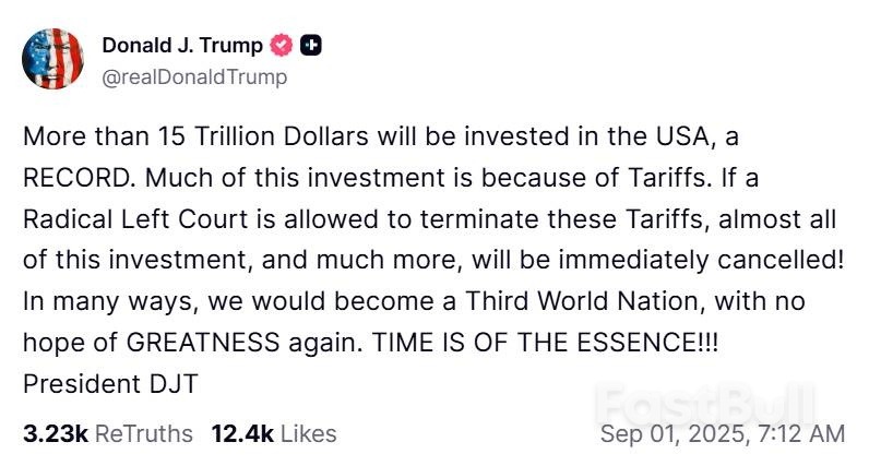 “超过15万亿美元将投资美国,创历史纪录。大部分投资源于关税,”他写道。“如果激进左派法院被允许终止这些关税,几乎所有投资乃至更多将立即取消!时间至关重要!!!”