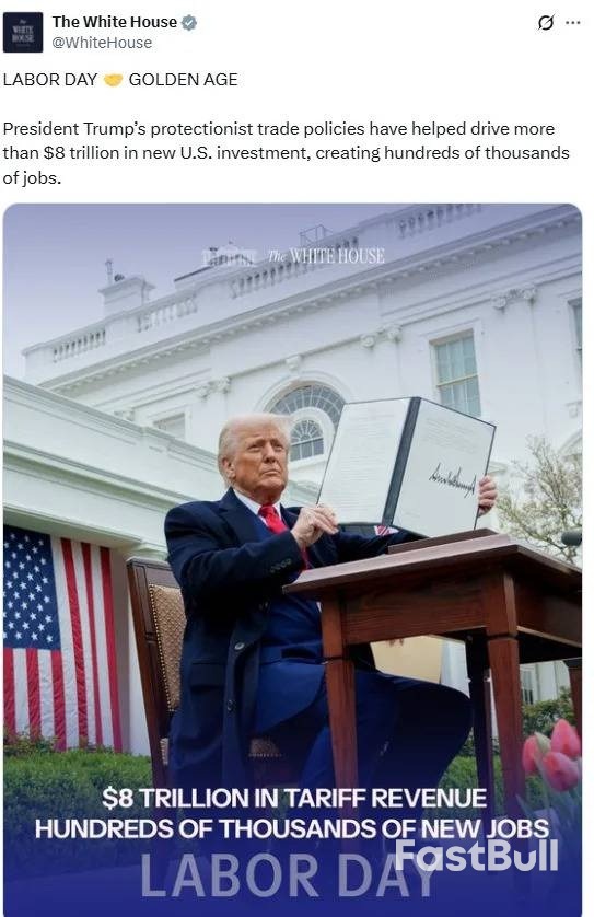 白宫在社交媒体X上的官方账号发布庆祝帖文,以此纪念美国劳动节并吹捧特朗普贸易政策的成功。然而,该帖文声称关税已为美国创造“8万亿美元关税收入”后,迅速引发困惑与质疑。