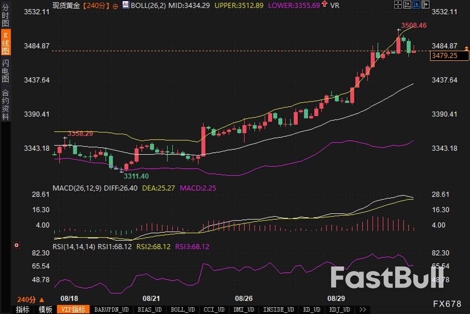 观察240分钟K线图,价格沿布林带上轨单边抬升,并在3508.46形成阶段摸高后回落;当前围绕3480运行。布林参数显示:中轨3434.29,上轨3512.89,下轨3355.69,带宽扩张,提示趋势交易主导。若以上轨3512.89为动态阻力、3508.46为静态阻力,二者构成上方重叠压制区;下方依次关注3470的短线分水、3434.29的中轨与3355.69的下轨共振支撑。