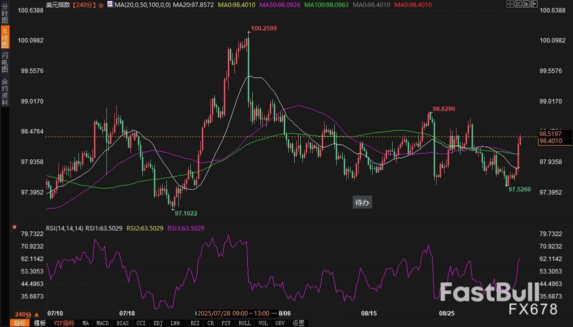 首先,从均线系统看,美元指数在240分钟图上已站稳所有关键短期均线上方。20周期简单移动平均线(SMA)位于97.8576,50周期SMA位于98.0926,而100周期SMA则在98.0964附近。这些均线正形成多头排列,且最新价格已远超所有这些支撑位,显示出强劲的上涨趋势。尤其值得注意的是,价格在近期探底97.1022后,便开始稳步回升,并突破了前期98.8290的高点,随后虽有回落,但迅速反弹,目前已逼近甚至超过了98.5197这个短期关键阻力,这表明市场对美元的看涨情绪强烈,卖盘力量相对较弱。