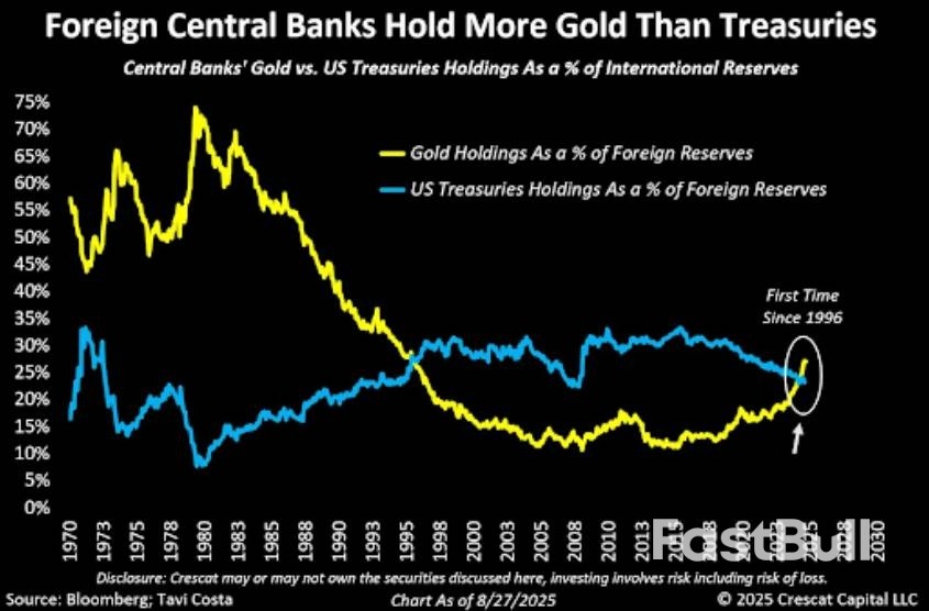 根据Crescat Capital宏观策略师塔维·科斯塔(Tavi Costa)在X平台发布的彭博数据,黄金创下新高之际,外国央行持有的黄金储备首次超越美国国债,这是自1996年以来的首次,是贵金属的一个重要里程碑。